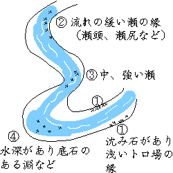 - 2. 流れの緩い瀬の縁(瀬頭、瀬尻などの縁)