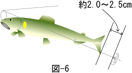つぎに、逆さバリを図-6のように掛け針が尾びれから、2~2.5㎝になるように、尻ひれにかけ、これで終了です。